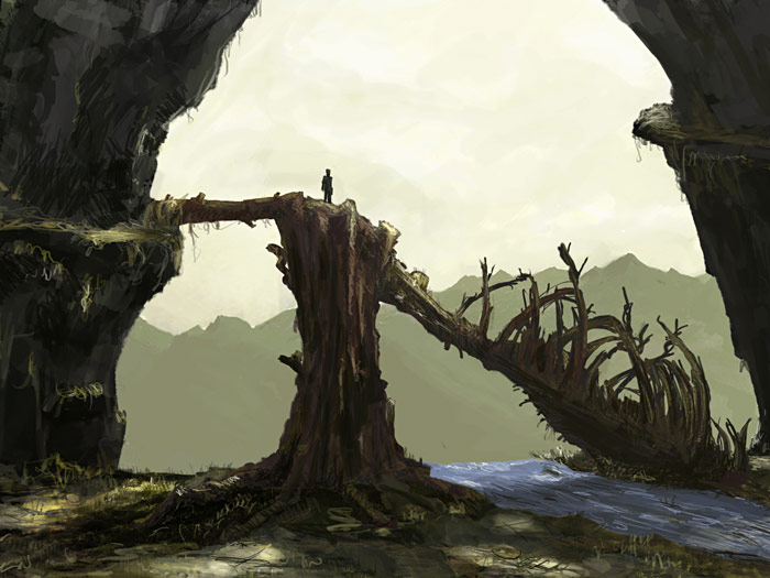 "Morning sunrise of a peaceful mountain top. The rushing waterfall drowns the screams and washes the blood of your opponents."